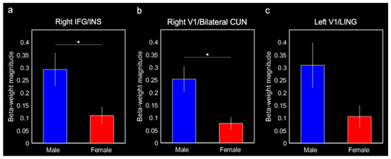 Mean beta-weight magnitudes extracted from three ROIs identified in the group entorhinal cortex connectivity results for males and females. Mean beta-weight magnitudes represent connectivity between the entorhinal cortex and (a) right IFG and insula (INS), (b) right V1 and cuneus (CUN), and (c) left V1 and lingual gyrus (LING). Error bars represent ± 1 standard error of the mean. * Bonferroni-corrected p < 0.05.