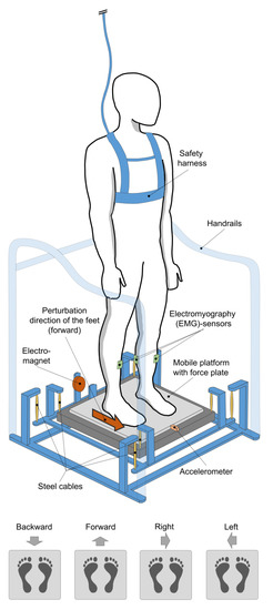 Prior to data acquisition, all the subjects were informed about the purpose of this study and provided written informed consent. All the procedures were conducted according to the recommendations of the Declaration of Helsinki and were approved by the ethics committee of the medical faculty of the University Leipzig (IRB number: 023/14-ff). Dynamic postural performance was investigated in four directions with respect to the displacement of the feet: backward, forward, right, and left. The subjects had to adjust their standing direction with respect to the electromagnet for each perturbation direction. For instance, to change from the forward perturbation direction to the left direction, subjects had to turn 90° to the right (Figure 1). Four trials were performed for each direction in a randomized order to minimize the influence of fatigue and habituation [63,66,68]. The subjects were instructed to stand on the force plate in a bipedal stance while barefoot, with an upright posture, keeping the knees straightened but not locked, both arms hanging down loosely, and directing their gaze ahead. To eliminate the effect of stance width on postural performance, both feet of each subject had to be aligned on predefined markers 15 cm apart [12,65]. The platform was released from the electromagnet (trigger) without previous warning and within varying time intervals, initiating unexpected horizontal perturbations with a peak acceleration of 5.7 m/s2 for each trial and subject. This perturbation intensity has been tested previously and was chosen to induce challenging in-place perturbations without causing subjects to step or fall [14,69,74,83,85,86,89]. The total duration of data acquisition for each trial lasted 7 s, including a 2 s pre-trigger and 5 s post-trigger interval. For each trial, subjects were instructed to maintain balance while data were recorded simultaneously using a routine written in LabView 8.0. All the subjects were secured with a safety harness by an assistant standing nearby.