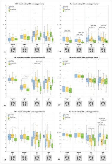 RMS muscle activity of gastrocnemius medialis (GM) (A–C) and tibialis anterior (TA) (D–F) of each study group, time interval, and perturbation direction, respectively. Pooled and averaged data of both sides of the body are presented for backward and forward perturbations. Data from the left and right sides of the body are presented individually for right and left perturbations. Statistically significant differences between study groups (p < 0.0042) are indicated as well as effect sizes, r. The cross within each box marks the mean value. Note that the platform only moved in post-trigger intervals 1 and 2, and that the initial perturbation directions from post-trigger interval 1 were inverted in post-trigger interval 2 because the platform swung back after reversal point 1.
