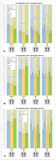 Co-contraction ratio (mean ± SD) between GM (lighter color) and TA (darker color) muscles for each study group, time interval (A–C), and perturbation direction, respectively. For backward perturbations, the GM worked as an agonist muscle and the TA worked as an antagonist muscle and vice versa under forward perturbations. Statistically significant differences between study groups of p < 0.0042 are indicated.