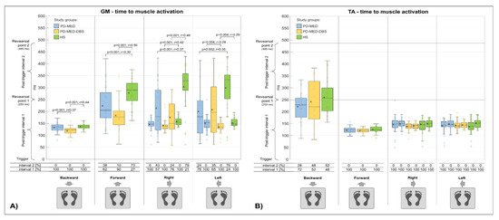 Time to muscle activation of the GM (A) and TA (B) muscles for each study group and perturbation direction, respectively. The table below the graph shows the percentage of subjects’ muscle activation within post-trigger interval 1 or 2. Statistically significant differences between study groups of p < 0.0042 are indicated.