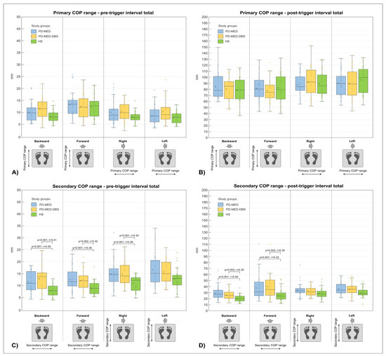 Comparing the study groups, statistically significant differences were found at the total pre-trigger and total post-trigger intervals, however only for the secondary COP ranges (Figure 6). The overall coefficient of variation of the COP range revealed higher group variability between the groups PD-MED (0.41 ± 0.14) and PD-MED–DBS (0.40 ± 0.14) compared to the HS group (0.34 ± 0.15). Between all four perturbation directions, no considerable differences were found for the primary COP range in any study group.