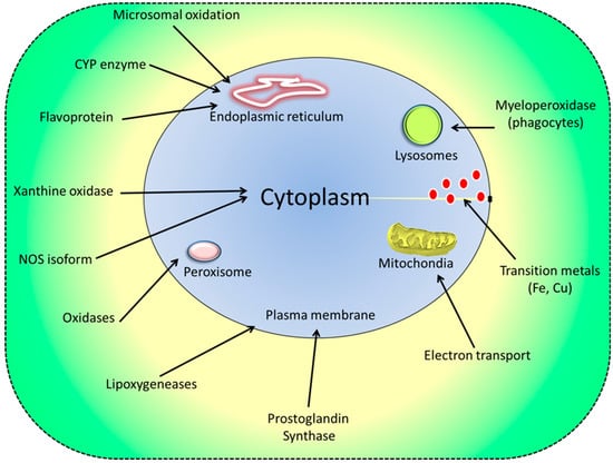 Endogeneous sources of ROS and RNS. Where, ROS, reactive oxygen species; RNS, reactive nitrogen species; CYP, cytochrome; NOS, nitric oxide synthase.