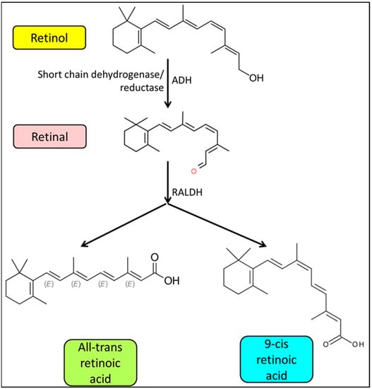 The oxidative process that is required to convert inactive retinol into useful retinoic acid takes place in two stages. Where, ADH, alcohol dehydrogenases; RALDH, retinaldehyde dehydrogenase.