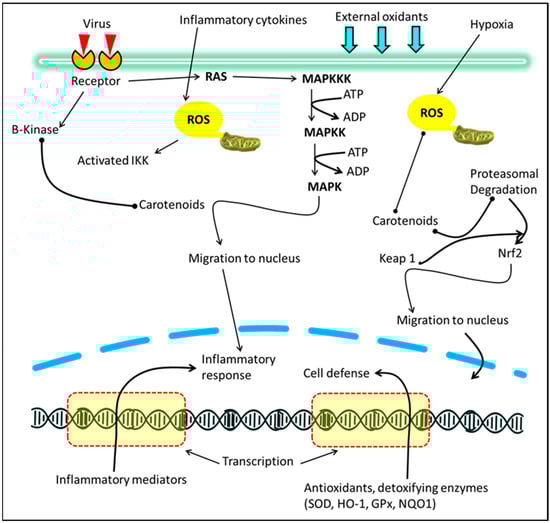 Carotenoids and the signaling pathways involved in inflammation. MAPK, mitogen-activated protein kinase; ROS, reactive oxygen species; Nrf2, nuclear factor erythroid 2–related factor 2; SOD, superoxide dismutase, RAS, rat sarcoma.