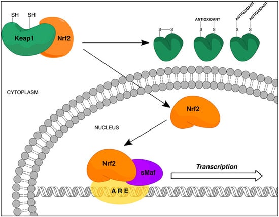 The mechanism by which Nrf2 promotes expression of genes that contain the ARE element. The migration of Nrf2 to the nucleus is made possible by the disruption of the Keap1–Nrf2 complex [47].