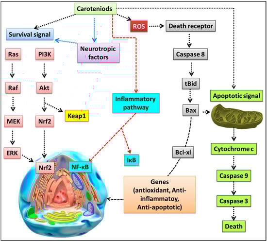 - Park, H.A.; Hayden, M.M.; Bannerman, S.; Jansen, J.; Crowe-White, K.M. Anti-Apoptotic Effects of Carotenoids in Neurodegeneration. Molecules 2020, 25, 3453. [Google Scholar] [CrossRef]