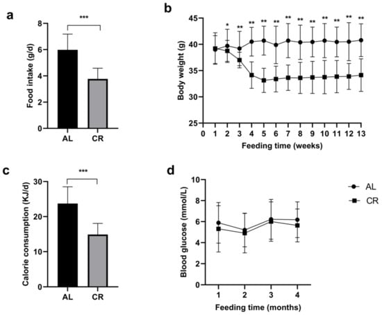 The daily food intake of the CR group was significantly less than that of the AL group (Figure 1a). Differences in body weight began to occur between the two groups in the second week (p = 0.009) and became significant in the third week (p < 0.001) (Figure 1b). Comparatively, the body weight of mice in the CR group was remarkably lower than that of mice in the AL group. Both groups showed relatively stable weight changes at different time points. During the 12-week intervention period, the average CR rate of the CR group was 37.3% compared with the AL group (Figure 1c). Regarding blood glucose, it was slightly lower in the CR group versus the AL group, which was not statistically significant (Figure 1d).