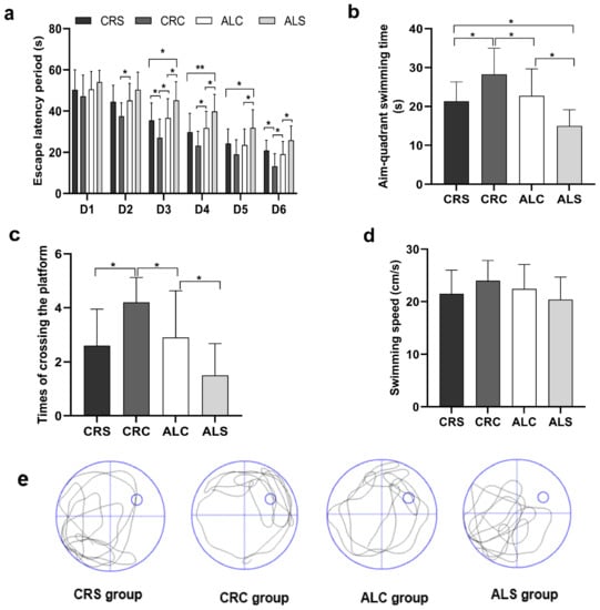 In the MWM test, the decline of learning ability was manifested by the extension of escape latency (Figure 2a). When comparing the ALC and ALS groups, the escape latency period on days 3, 5, and 6 was statistically shorter in the ALC group (p < 0.05). Additionally, the period on days 3 and 6 was significantly shorter in the CRC group than that in the CRS group (p < 0.05), and that on days 3, 4, and 5 was remarkably shorter in the CRS group than that in the ALS group (all p < 0.05). When comparing the ALC group with the CRC group, the latency period on days 2, 3, 4, and 6 was relatively prolonged, with statistically significant differences (p < 0.05).