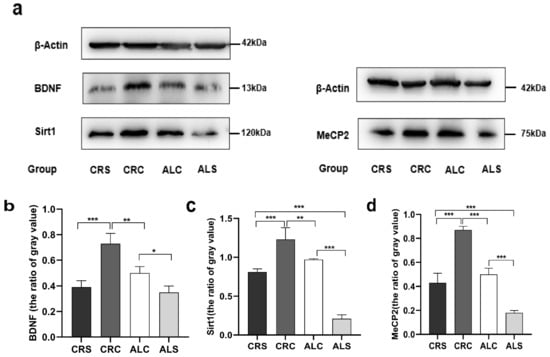 The results of the western blot showed that the level of BDNF in the ALC group was significantly higher than that in the ALS group (p < 0.05, Figure 3b), but significantly lower than that in the CRC group (p < 0.05, Figure 3b). Compared with the CRS group, the expression of BDNF was significantly higher in the CRC group (p < 0.05, Figure 3b). The expression of Sirt1 in the ALS group was significantly lower compared with the ALC group and the CRS group (p < 0.05, Figure 3c). On the contrary, the Sirt1 expression was much higher in the CRC group compared with the CRS group and the ALC group (p < 0.05, Figure 3c). The MeCP2 level in the ALC group was significantly higher than that in the ALS group (p < 0.05, Figure 3d), as well as in the CRC group compared with the CRS group (p < 0.05, Figure 3d). The level of MeCP2 in the CRC and CRS groups was higher than that in the ALC and ALS groups, respectively (p < 0.05, Figure 3d).