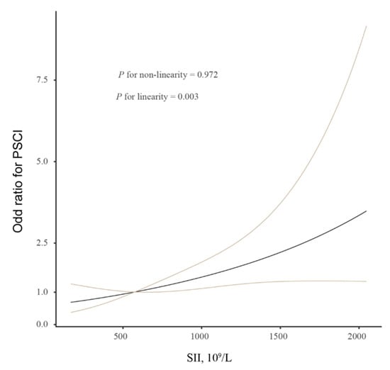 In order to study whether the SII index could be used as an effective variable for the diagnosis of the presence and severity of PSCI, we utilized a multivariate logistic regression analysis. The results of the logistic analysis were demonstrated in Table 3. After controlling for age and sex, a high SII index is a significant risk factor for PSCI (per 1-SD increase, OR, 2.045; 95% CI, 1.347–3.106; p = 0.001; Model 1). In Model 2, after further controlling for education years, hypertension, diabetes, stroke subtypes, baseline NIHSS score, and Hs-CRP levels, an increased SII index also significantly correlated with 3-month PSCI (per 1-SD increase, OR, 2.341; 95% CI, 1.439–3.809; p = 0.001). Similar significant findings were observed when SII was categorized according to the quartile. In addition, the multiple-adjusted spline regression model showed a linear association between the SII index and cognitive impairment (p = 0.003 for linearity; Figure 1).