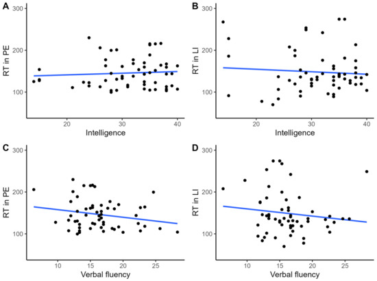 No statistically significant linear relationship was observed between intelligence or verbal fluency scores and RTs in both the PE (r = 0.074, p = 0.603; r = −0.124, p = 0.346) and the LI (r = −0.076, p = 0.562; r = −0.081, p = 0.536) conditions, respectively (see Figure 3).