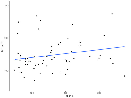 A scatter plot and linear fit illustrating the relationship between reaction time in the LI and PE conditions.