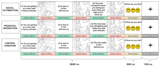 Participants were shown a sequence of three pictures alternated with three sentences, depicting a dyadic social interaction (Figure 1). The pictures included an interaction between two characters: the recipient, with whom the participants were requested to identify, and the agent, the person interacting with the recipient. One type of social interaction was displayed for each trial: social victimization, prosocial interaction, or control conditions. In the prosocial interaction, the recipient was helped to perform a task or given positive feedback by the agent. In the social victimization condition, the recipient was ignored during a task that needed external help or was given harsh feedback. The control condition showed a scene where the receiver accomplished a result without the direct involvement of the agent. Due to our focus on social victimization interactions, participants were shown 60 trials of social victimization, 30 of prosocial interaction, and 30 of the control condition without repetitions. After the presentation of the social interaction trial (18 s), an affect-rating image was presented for 3 s (see Supplementary Material).