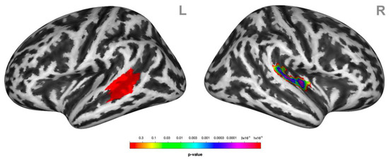 Psychophysiological interactions (PPIs) associated with receiving social victimization behavior. Functional coupling of the left lateral middle superior temporal gyrus (MTG/STG, here highlighted in red) (L) was decreased with the right superior temporal gyrus STG (R) during social victimization relative to the control condition. Statistical maps of the PPIs are rendered on a Montreal Neurological Institute template with a cluster-level family-wise error correction of p < 0.05. The color bar indicates the p-value. L and R indicate the left and right brain hemispheres, respectively.