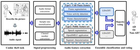 The framework of the proposed method is shown in Figure 1. First, the participant was asked to perform a picture description task (“Cookie Theft” picture), during which their voice was recorded. Second, the speech signal was pre-processed to standardize it for next processing. Then, two types of features were extracted from speech signals. The first was the VAD-based pause feature proposed by the research, and the other was the feature from the common feature set. We compare the effectiveness of features on different classifiers. At the same time, in order to integrate the advantages of different types of features, we also designed a feature ensemble method based on the major voting strategy to obtain a better AD detection performance.