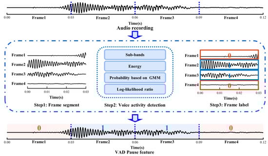 Initially, we sectioned a voice recording into audio frames, and then used WebRTC VAD to detect each audio frame. Ultimately, a piece of audio datum was marked as the voiced and non-voiced frame according to the scale of audio frame, and this sequence was regarded as the pause feature of the speech. As shown in Figure 2, we set the frame duration to 0.03 s, such that the original 0.12 s of audio data turned into the VAD Pause feature, which was a sequence with four labels. Zero represents the non-voiced frame, and one represents the voiced frame.