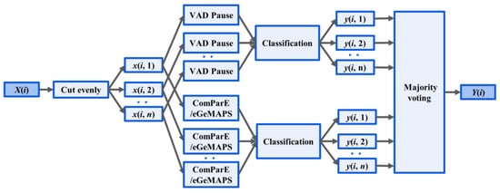 Ensemble Method: X(i), the audio recording, was divided into n segments x(i, n). Acoustic feature extraction (VAD Pause, ComParE and eGeMAPS) was performed at the segment level. The output of classification for the nth segment of the ith recording is denoted y(i, n). Y(i) outputs the majority voting for classification.