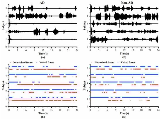 To investigate whether the speech of the AD and controls differed in pauses, we visualized the original speech recordings and VAD Pause features to analyze and confirm the difference from a visual point of view. We selected ten audio clips (half of the speakers were AD subjects, and half were non-AD) of about 1 min length from the test set of the ADReSS2020 dataset. Then, we intercepted the first 24 s of data and extracted their VAD Pause features from them. Figure 4 shows the raw voice waveform (A,B) and VAD Pause features of the voice recordings (C,D).