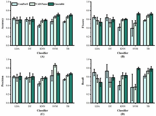 Figure 6 shows the classification results of the proposed VAD Pause feature and eGeMAPS, using five machine-learning methods on the dataset ADReSSo. It can be observed that the VAD Pause feature proposed in this study had a better classification performance and smaller error bars than the eGeMAPS on the same dataset using LDA, KNN, DT, and TB. Our VAD Pause with the TB had the best effect, reaching 65.6% accuracy, 62.3% F1 score, 68.3% precision, and 58.3% recall. Thus, it performed better than the acoustic feature-based baseline accuracy of 64.8% obtained by [30].