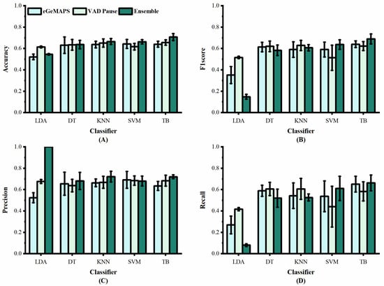 We applied the VAD Pause to five machine-learning methods employed previously by [29,30], namely LDA, DT, KNN, SVM, and TB, for AD and non-AD classification. The classification results of all methods on the datasets ADReSS and ADReSSo, are reported in Figure 5 and Figure 6, respectively. For a fair comparison, the ComParE with the best effect used in the literature [29] was selected and tested on the dataset ADReSS, while the eGeMAPS used in the literature [30] was selected and tested on the dataset ADReSSo. All classifiers used the same parameters as those in the literature, and each classification was performed with five runs and shuffling the data order. The average results of the operations are shown in the figures.