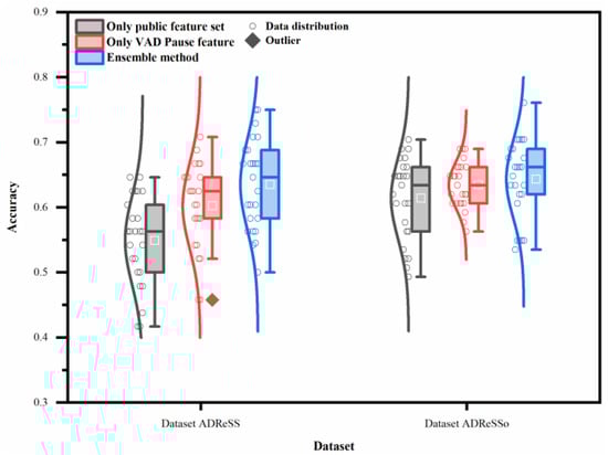 Comparisons with other methods using the same data attract particular interest. Table 3 shows that methods using acoustic features for AD detection can be divided into two categories: those that use DL and those that do not. Our ensemble method achieves the best results among methods that do not rely on DL [29,30,39,44]. In the dataset ADReSS, the pre-trained VGGish model and Uni-CRNN are used in the method proposed by [35]. An accuracy of 72.9% was achieved with this method. In addition, among the DL-related approaches, some studies use neural networks as classifiers, while others focus on using them to extract acoustic embeddings. Cummins et al. [36] and Rohanian et al. [37] combined public acoustic features with neural networks and achieved an accuracy of 70.8 and 66.6%, respectively. Acoustic embeddings as speech features started to attract the attention of numerous researchers, and have gained good performance in AD detection [38,40,41,42,43]. There appears to be a trade-off in accuracy and convenience. Methods using DL are more accurate, but methods without DL are more convenient. A better approach could involve using VAD Pause and acoustic embeddings to represent speech information. Due to time cost and practicality, we will further explore this idea in future.