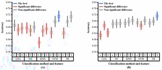 Multiple analysis results (classifiers and features as factors) on the two datasets: (A) dataset ADReSS; (B) dataset ADReSSo. C, ComParE; V, VAD Pause; E, ensemble; e, eGeMAPS. Blue lines represent the optimal performance, red lines represent significant difference from the optimal performance, gray lines represent non-significant difference from the optimal performance.