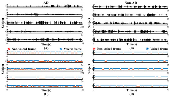 Contrast display of representative signals from AD and non-AD subjects: (A) raw audio recordings of AD; (B) raw audio recordings of non-AD; (C) VAD Pause features of AD; (D) VAD Pause features of non-AD. The blue asterisks represent voiced frames, whereas red represent non-voiced frames in the figure of pause features.