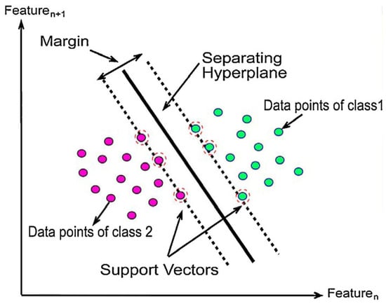 SVM is one of the most extensively used machine learning methods in medical image processing. It is a supervised algorithm first introduced by Vishwanathan and Murty [33], and it has been developed over the years. It performs classification and regression analysis on data. SVM divides the data into classes in the training sets by identifying the best decision boundary. This aids in classifying new data added to the correct side of the separator, known as a hyperplane. The hyperplane is generated by selecting a data set’s extreme points, which are referred to as support vectors. Figure 3 shows the SVM hyperplane for linearly separable data points.