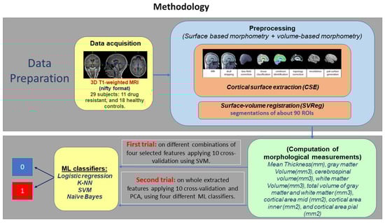 - Sahebzamani, G.; Saffar, M.; Soltanian-Zadeh, H. Machine learning based analysis of structural MRI for epilepsy diagnosis. In Proceedings of the 2019 4th International Conference on Pattern Recognition and Image Analysis (IPRIA), Tehran, Iran, 6–7 March 2019; pp. 58–63. [Google Scholar]