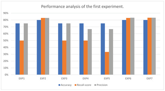 The first trial was an SVM classifier trained on different combinations of the four selected measurements: cortical thickness, grey matter volume, cerebrospinal fluid volume, and white matter volume. To evaluate the experiments, accuracy, recall score, and precision were calculated for each combination, as shown in Table 2. The Exp2, Exp6, and Exp7 combinations obtained the best accuracies, with 80.00%. GridSearchCV was used to select the best models’ parameters. Figure 7 shows accuracy, recall score, and precision of different combinations of measurements in this trial.