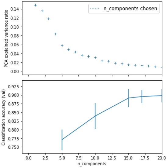 The second trial contains more intensive experiments. Four different ML classifiers were used on all extracted measurements, as shown in Table 3. Before training the classifiers, the principal component analysis (PCA) technique was applied to reduce the number of features. We found that the best number of features (n_components) was 20. Figure 8 shows the variance ratio classification accuracy of PCA.