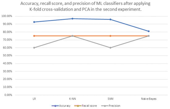 Accuracy, recall score, and precision of ML classifiers after applying K-fold cross-validation and PCA in the second trial.