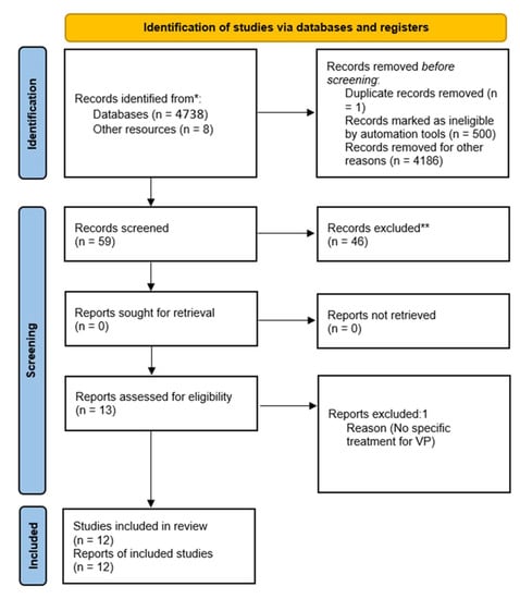 A PRISMA flow diagram is shown in Figure 1. After reading the articles and removing duplicates, a total of 12 original studies were finally included in the systematic review and are summarized in Table 1 and Table 2. Table 3 shows the studies performed using neuroimaging studies. Finally, a meta-analysis was not performed as we have not found studies on the response to levodopa in VP since the last systematic review and meta-analysis of 2017 and there are insufficient studies on other treatments to perform it on another treatment subgroup.