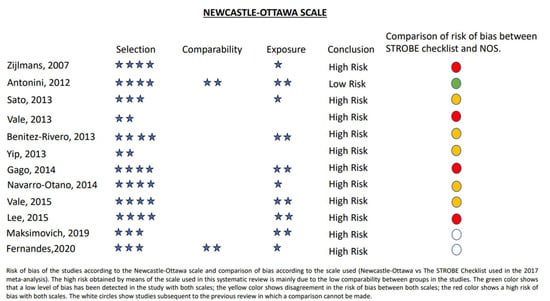 As no randomized studies were found in the search, the Cochrane Collaboration tool for assessing risk of bias was not used. The risk of bias in the included studies was assessed using the Newcastle–Ottawa Scale. This can be seen in Figure 2 together with a comparison of the results of this scale with the STROBE scale used in the previous systematic review.