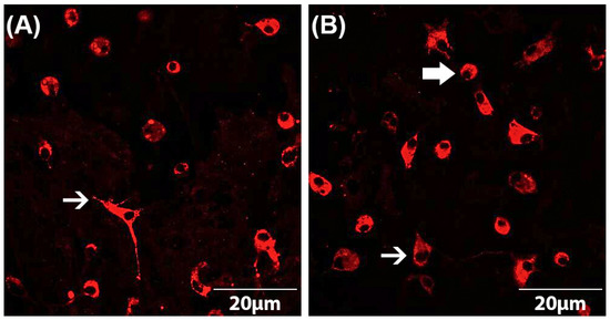 Microglia morphology in astrocyte–microglia co-cultures detected by immunocytochemistry. Staining with the antibody ED-1 (red) allowed the classification of microglia as resting ramified type (RRP) (white arrow in (A)), intermediate (INT) (thin, white arrow in (B)) and activated rounded phagocytic type (RPT) (thick, white arrow in (B)). Fluorescence microscopic images at a magnification of 600×.