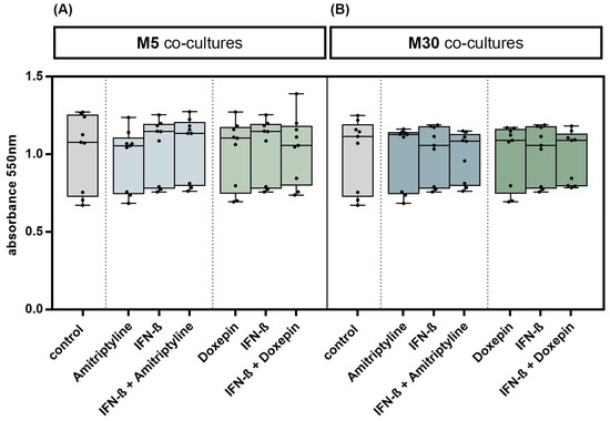 Incubation with doxepin, amitriptyline or IFN-β did not significantly change the glial cell viability in M5 co-cultures, representing “physiological” conditions (Figure 2A), and in M30 co-cultures, representing “pathological” conditions (Figure 2B) (n = 9). In addition, no significant changes in the glial cell viability were observed after co-incubation with doxepin or amitriptyline of IFN-β pre-treated co-cultures (n = 9) (Figure 2A,B) (p = ns).