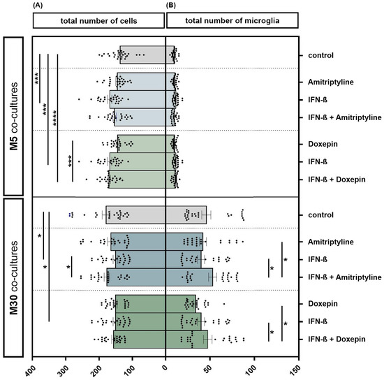The incubation of physiological M5 co-cultures with 2000 U/mL IFN-β for 22 h resulted in a significant increase in the total cell number by 22.2% (n = 27) compared to the control (p < 0.001: ***) (Figure 3A). The additional incubation of IFN-β pre-treated M5 co-cultures with 10 ng/mL doxepin for 2 h led to an overall increase in the total cell number by 23.7% (n = 27) compared to the control (p ≤ 0.0001: ****). Moreover, incubation of IFN-β and doxepin led to a significant increase in the cell number by 17% compared to incubation with doxepin alone (n = 27) (p < 0.001: ***). However, incubation of the M30 co-cultures with 2000 U/mL IFN-β for 22 h led to a significant reduction in the total cell number by 15% compared to the control (n = 27) (p < 0.05: *) (Figure 3A). In contrast, the additional incubation with 10 ng/mL amitriptyline led to a significant increase in the cell number by 16.9% (n = 27) compared to the incubation with IFN-β alone (p < 0.05: *) (Figure 3A). Incubation with 10 ng/mL amitriptyline, 10 ng/mL doxepin or 2000 U/mL IFN-β caused no significant changes in the number of microglia detected by immunocytochemistry in the physiological M5 co-cultures (Figure 3B). In the pathological M30 co-cultures, pre-incubation with IFN-β and subsequent incubation with amitriptyline or doxepin led to a significantly increased number of microglia compared to incubation with amitriptyline, doxepin or IFN-β alone (n = 27) (p < 0.05: *) (Figure 3B).