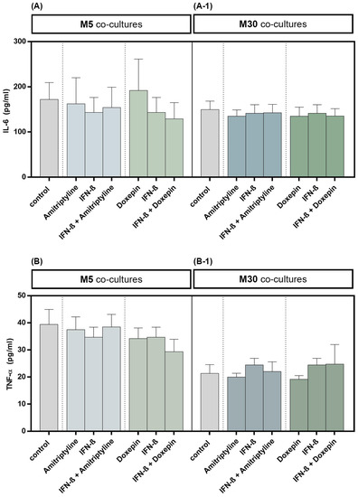 The TNF-α and IL-6 cytokine levels in cell culture supernatants were quantified by ELISA. Incubation with 10 ng/mL amitriptyline or 10 ng/mL doxepin for 2 h, or with 2000 U/mL IFN-β for 22 h, did not influence the IL-6 concentration in M5 (n = 9) as well as M30 (n = 9) co-culture supernatants compared to controls (Figure 5A,A-1) (p = ns). No significant changes in TNF-α cytokine concentration, in comparison to the controls, were measured in the supernatants of M5 (n = 9) and M30 (n = 9) co-cultures after incubation with the drugs (Figure 5B,B-1) (p = ns). The TNF-α and IL-6 cytokine levels in M5 and M30 co-cultures (n = 9) were not affected also after pre-incubation with IFN-β and subsequent amitriptyline or doxepin addition (Figure 5) (p = ns).