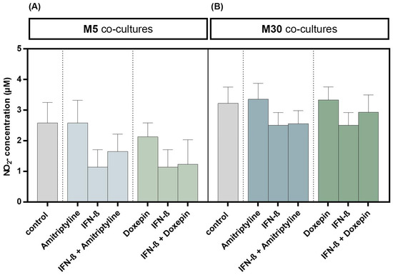 Nitric oxide (NO) concentration determined based on measurement of nitrite (NO2) as a primary breakdown product of NO using Griess (NO) assay in the physiological (M5) (A) and pathological (M30) (B) astrocyte–microglia co-cultures after incubation with 10 ng/mL amitriptyline or 10 ng/mL doxepin for 2 h, or with 2000 U/mL interferon-β (IFN-β) for 22 h. Incubation with the antidepressants or IFN-β alone did not result in significant changes in NO2 concentrations in physiological (A) or pathological (B) co-cultures (n = 9). Moreover, the co-incubation with amitriptyline or doxepin of IFN-β pre-treated co-cultures did not lead to NO2 changes (n = 9). Untreated co-cultures were used as controls. The individual experimental conditions were compared by two-tailed t-test. No significant differences between the individual conditions were detected (p = ns).