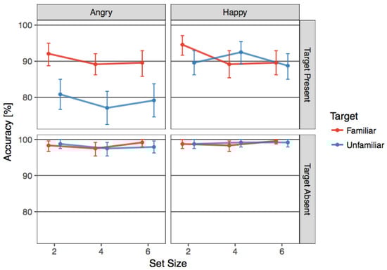 In the target present condition, the fixed effects in the model with the lowest AIC were set size, familiarity of the target, target expression, and their interactions. We also added the fixed effect of target sex. The random effects for this model included slopes and intercepts for participants. The set size of the items in the search array did not have a significant effect on the accuracy ( χ 2 (2) = 4.74, p = 0.09). We found significant effects of familiarity ( χ 2 (1) = 21.03, p < 0.001) and expression ( χ 2 (1) = 21.43, p < 0.001). The interaction between these two fixed effects was also found to be significant ( χ 2 (1) = 12.15, p < 0.001) while none of the other interactions were found to be significant (set size × familiarity: ( χ 2 (2) = 4.41, p = 0.1), set size × expression: ( χ 2 (2) = 1.16, p = 0.55), set size × familiarity × expression: ( χ 2 (2) = 3.0, p = 0.22)). Lastly, we also found a significant effect of the sex of the target ( χ 2 (1) = 4.02, p = 0.04) (Figure 2). The analysis of individual contrasts revealed that subjects were more accurate for familiar targets overall (familiar: 94.65% [93.96,95.35], unfamiliar: 91.60% [90.73, 92.43]; numbers in brackets indicate the bootstrapped 95% confidence intervals), and for targets with a happy expression as compared to the angry conditions (happy: 94.83% [94.10, 95.56], angry: 91.42% [90.56, 92.29]). The significant interaction between the two terms reflected that the advantage of familiarity on accuracy in the target present condition was found only for angry targets (90.28% [88.33, 92.08] versus 79.03% [76.53, 81.53]) and was absent for happy targets (91.11% [89.17, 92.92] vs. 90.28% [88.33, 92.22]).