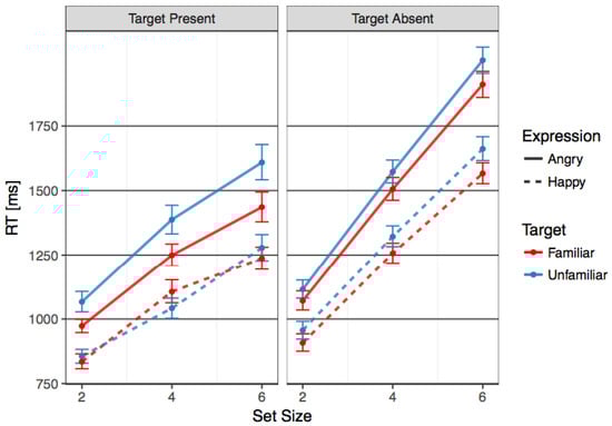 Figure 3. Reaction times (ms) as a function of set size of images. Longer reaction times were observed for unfamiliar faces when the target was an angry expression. Error bars indicate 95% bootstrapped confidence intervals.