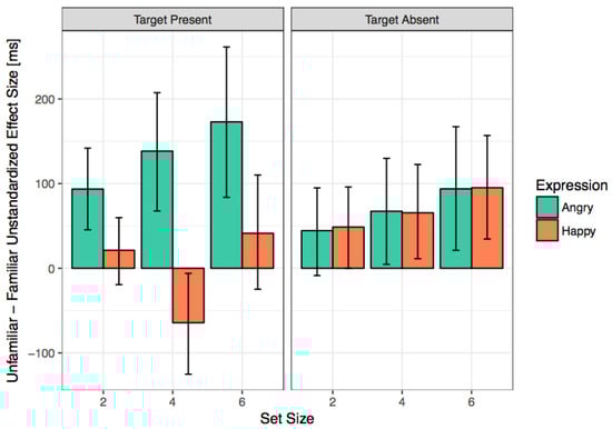 Only correct trials were included in the analysis of reaction times. We fitted a linear mixed model to our data, with log-normalized reaction times as our dependent variable. As with accuracy, we analyzed reaction times in the target present and absent conditions separately. The main effects in the model with the lowest AIC included set size, familiarity of the target, target expression, and the interactions between these variables. We also included the main effect of target sex in the model. The random effects included slopes and intercepts for the participants and the slopes for the different image combinations. We found a significant effect of set size ( χ 2 (2) = 504.77, p < 0.001), target familiarity ( χ 2 (1) = 11.13, p < 0.001), target expression ( χ 2 (1) = 206.64, p < 0.001), and target sex ( χ 2 (1) = 37.04, p < 0.001). The interaction between target familiarity and expression was also found to be significant ( χ 2 (1) = 12.47, p < 0.001), while none of the other interaction terms were significant (set size × familiarity: ( χ 2 (2) = 3.26, p = 0.19), set size × expression: ( χ 2 (2) = 2.29, p = 0.31), set size × familiarity × expression: ( χ 2 (2) = 2.96, p = 0.22). Overall, in the target present condition, familiar targets were detected 135 ms [95, 175] faster than the unfamiliar targets for angry expressions, and 1 ms [−33, 31] slower for happy expressions (Figure 3).