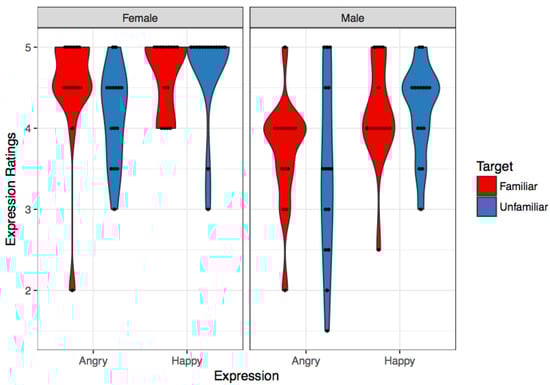 We also analyzed the ratings for how recognizable happy and angry expressions were in each target identity. We fitted a generalized linear mixed model to the rating data, with the rating for how recognizable the expression was as the dependent variable, and target familiarity, expression, and sex as independent variables. The model with the lowest AIC included subject specific slopes and intercepts as random effects. We used the Poisson distribution as the linking function for this model.