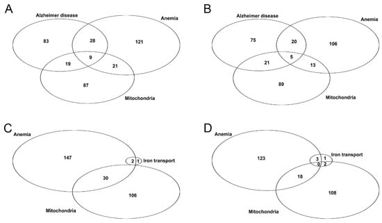 For patients with initial AD vs. control subjects, Venn diagrams illustrating the number of genes with overlapping expression differences in the categories of AD, anemia, and mitochondria for (A) upregulated; and (B) downregulated genes. Venn diagrams illustrating the number of genes with overlapping expression differences in the categories of iron transport, anemia, and mitochondria for (C) upregulated; and (D) downregulated genes.