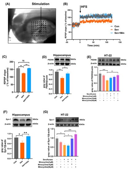 3.2. Minocycline Attenuates Sevoflurane-Induced Synaptic Plasticity Impairment