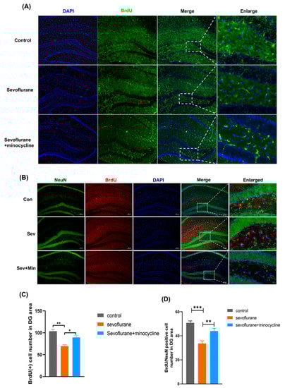 3.3. Minocycline Alleviates Sevoflurane-Induced Neurogenesis Dysfunction