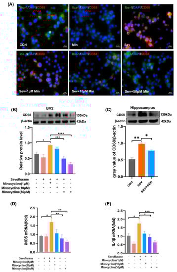 3.5. Minocycline Suppresses Sevoflurane-Associated Microglial Activation to the M1 Stage and Reduces Proinflammatory Cytokine Production