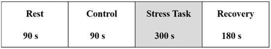 The study design is presented in Figure 1. In the rest phase, the participant was asked to rest in a comfortable condition, while, in the control phase, the participant was asked to calculate arithmetic operations, without stress-inducing conditions. In the stress-task phase, the participant calculated the problem under a stress-inducing condition; the study set a time limit of 3 s using a timer to induce stress, and the participant’s average score and the results (correct, incorrect, and no response) were presented for 2 s as soon as they solved the problem, before moving on to the next question. Afterwards, in the recovery phase, the participant rested in a comfortable condition.