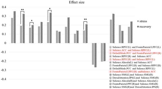 Comparison of the effect sizes of common functional connectivity in the stress phase and recovery phases. Red color : FC with statistically significant difference (** p < 0.01, * p < 0.05).